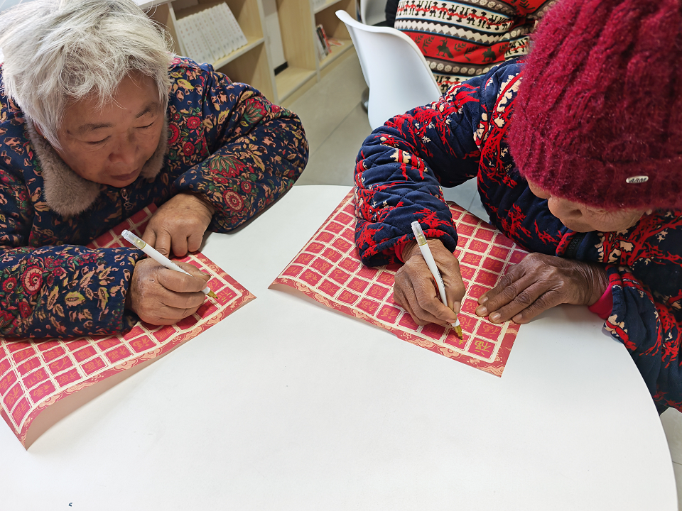 巧手临福,串联邻里温情纽带。最受村民欢迎的当数临摹新年福字环节。志愿者提前备好红临摹纸、金色笔等材料,现场示范教学并讲解福字文化寓意,村民们热情高涨,邻里间切磋技巧、互传经验,农家书屋里欢声笑语不断。一张张红彤彤、金灿灿的福字,既承载着新春美好期许,更串联起邻里温情与和睦默契。